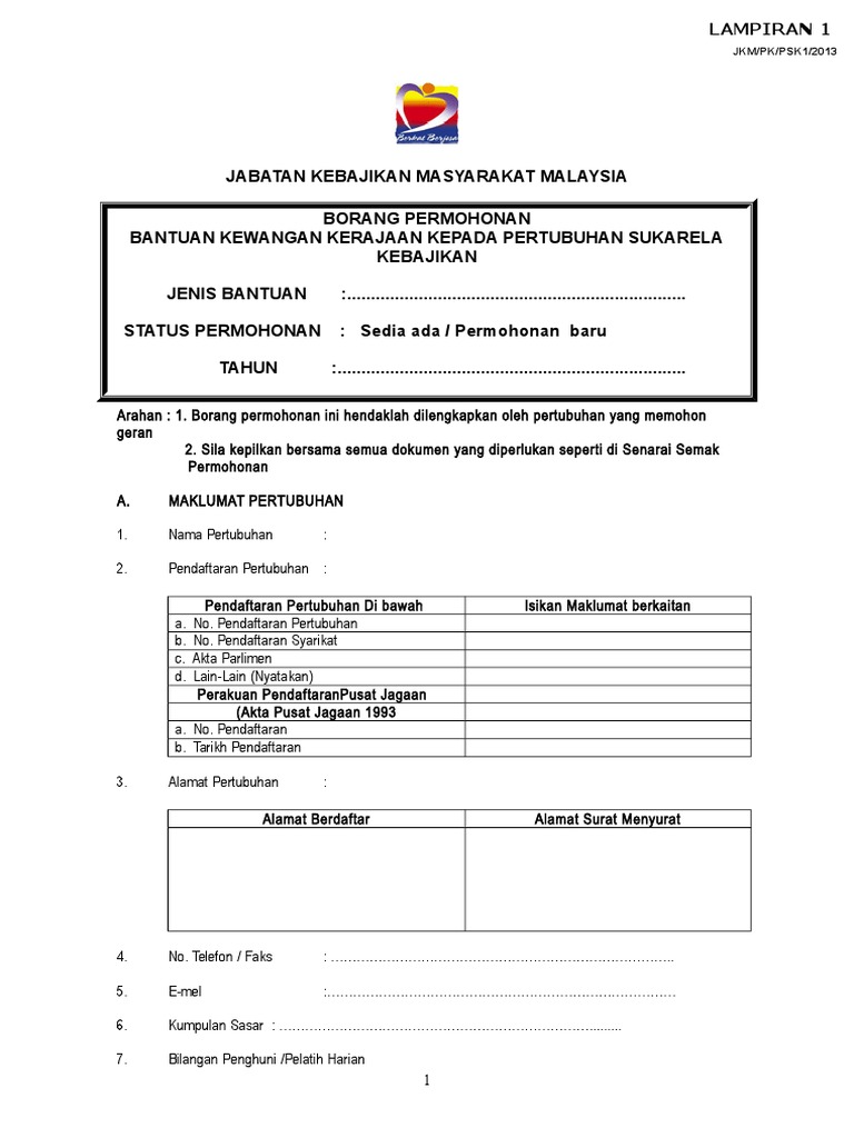 Borang Permohonan Geran Bantuan Kewangan Kerajaan Kepada Psk Pdf